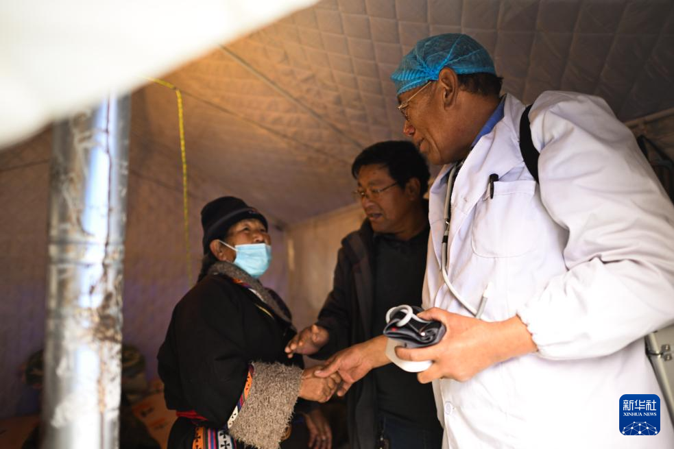 12月22日,完么仁增在牙木村應(yīng)急醫(yī)療點(diǎn)為村民量血壓。新華社記者 張龍 攝