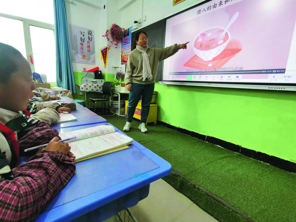 老師解萌萌借助智能黑板,通過視頻給學(xué)生講授中國傳統(tǒng)節(jié)日和文化。