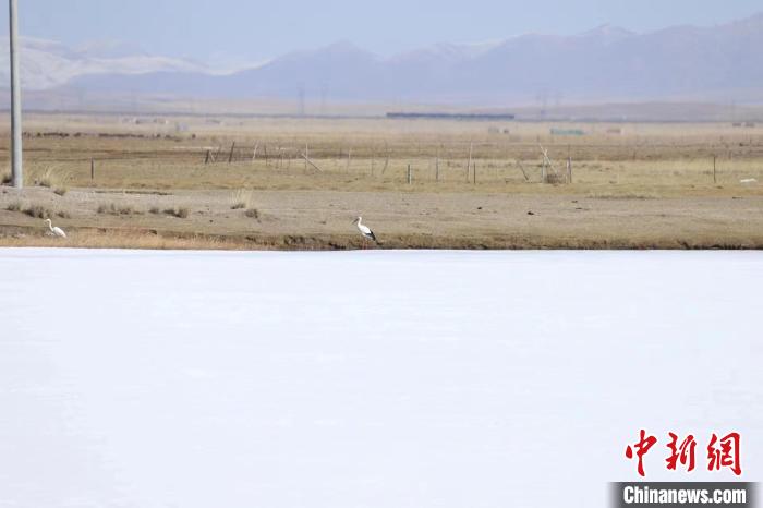 3月27日,東方白鸛在青海湖畔。(青海湖國家級自然保護區(qū)管理局供圖)