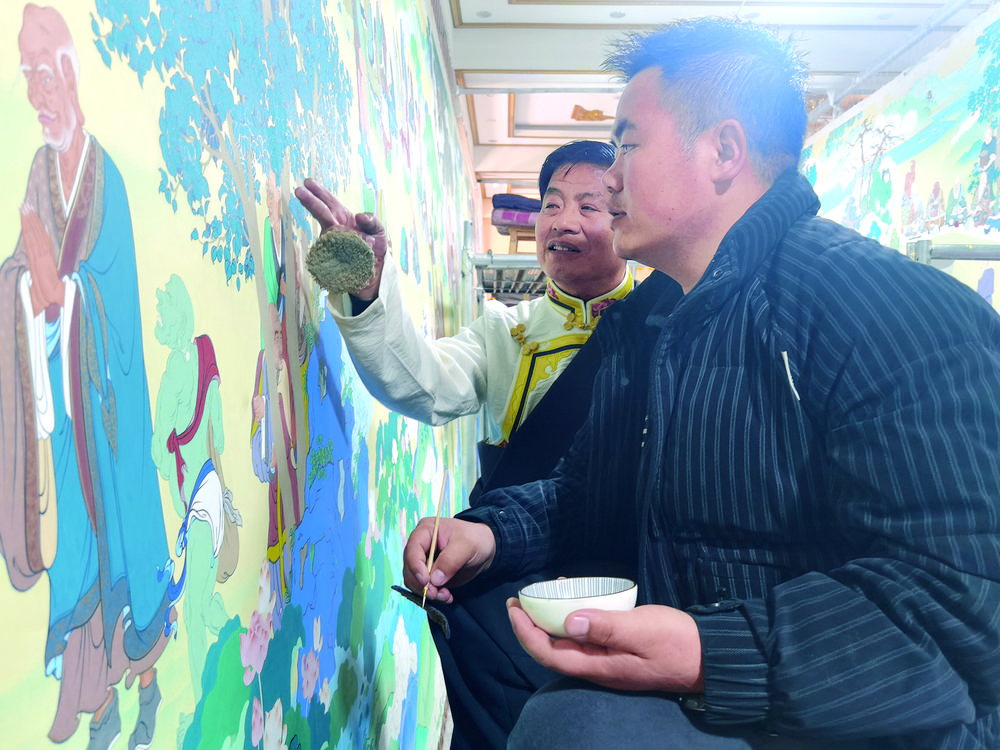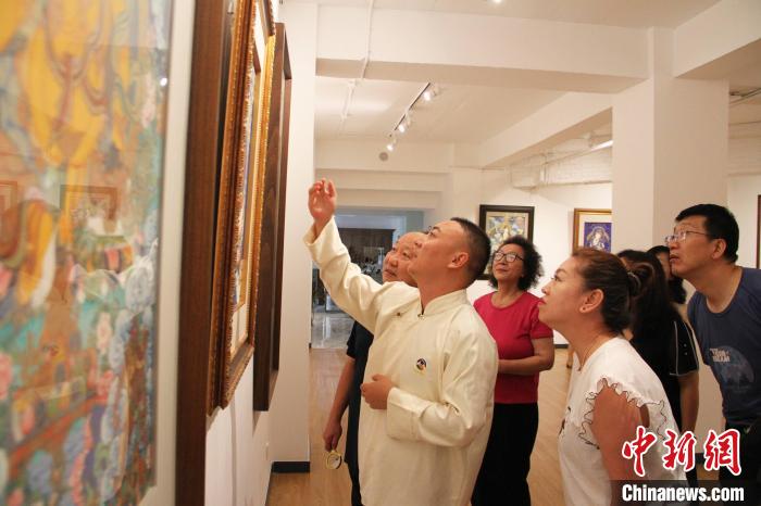 “小范,朱砂顏色有點厚,碗里再加點水,顏料稠度要合適,這樣顏料不易從畫布上剝落……”扎西尖措耐心地指導(dǎo)徒弟范慶基。每天,扎西尖措都會來畫室轉(zhuǎn)轉(zhuǎn),為徒弟指出繪畫、上色等方面的不足之處,幫助他們更快進(jìn)步。