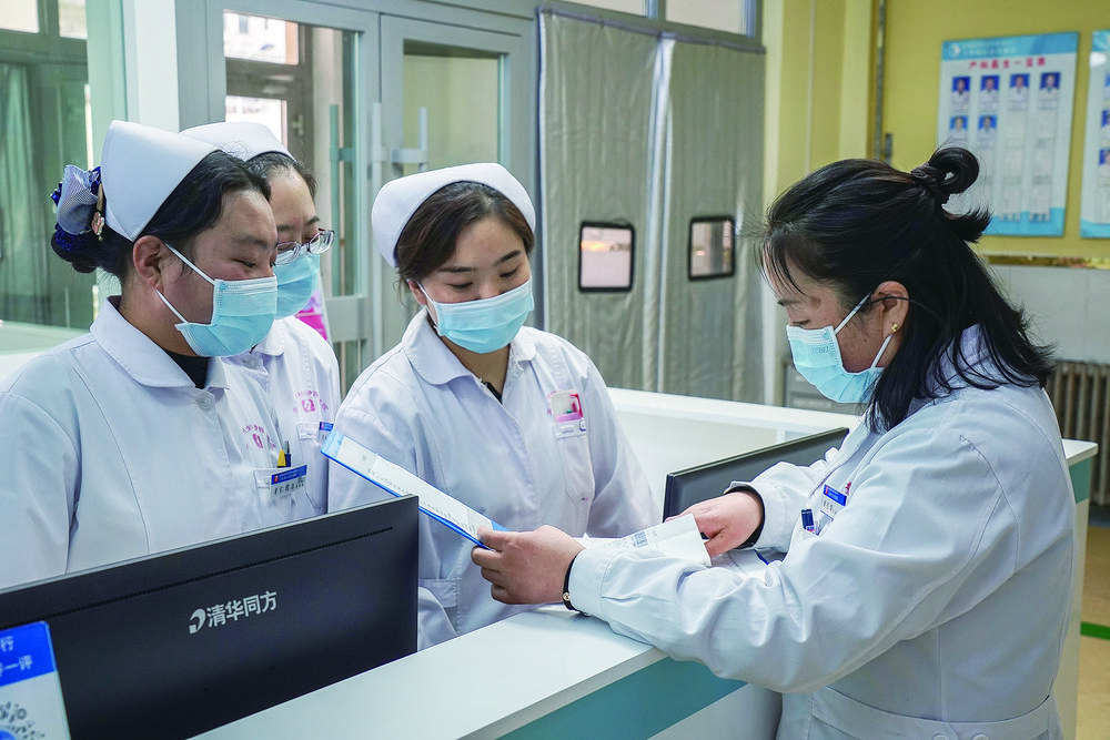 黃長珠(右一)與護(hù)士討論巡診情況。張得俊 攝