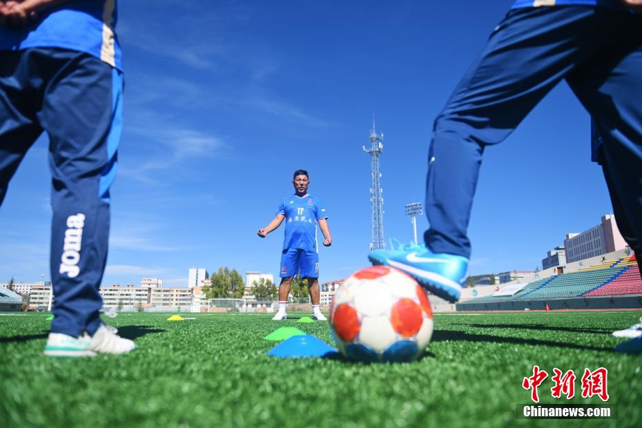 10月15日,在甘肅省甘南藏族自治州合作市一足球場內(nèi),甘南九二聯(lián)隊隊長久西道杰指導(dǎo)球員球技。