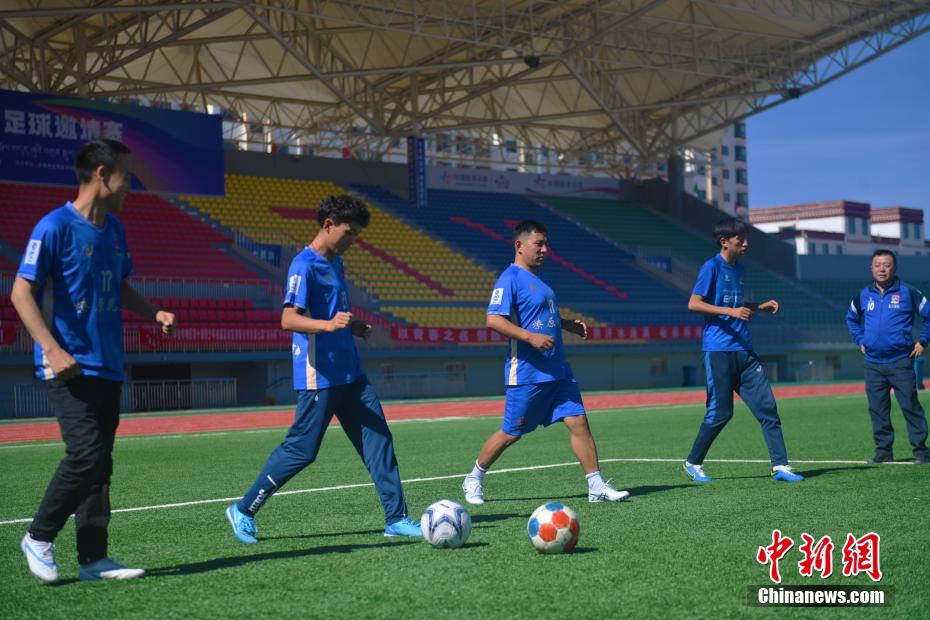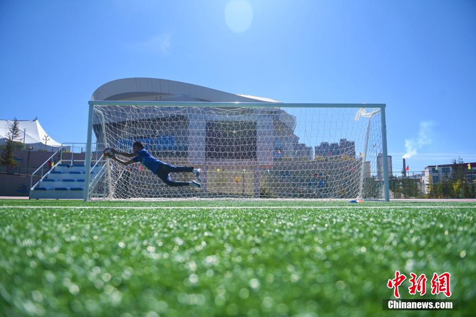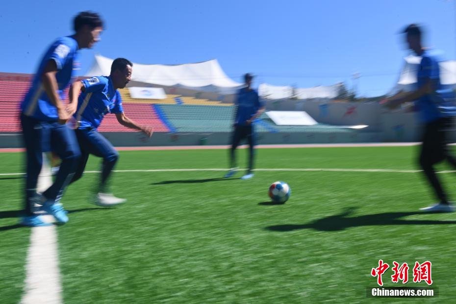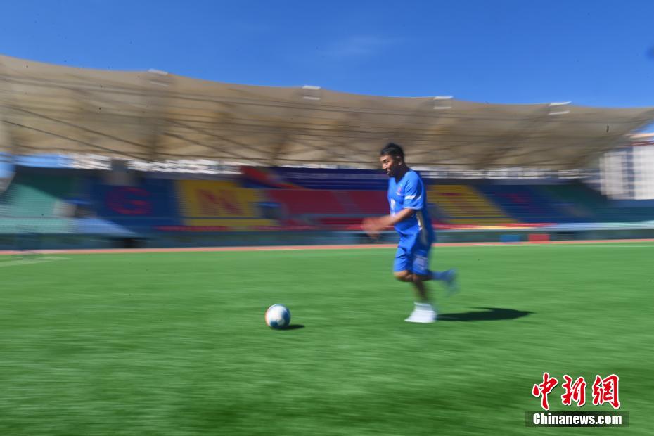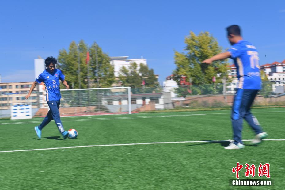 10月15日,在甘肅省甘南藏族自治州合作市一足球場內(nèi),甘南九二聯(lián)隊足球隊員進行訓(xùn)練。