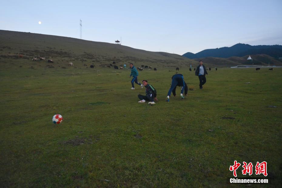10月15日,在甘肅省甘南藏族自治州合作市一牧場內(nèi),甘南九二聯(lián)隊足球隊員進行訓(xùn)練。該足球隊已成立32年,由牧民、務(wù)工者、歌舞演員、個體戶、老師、學(xué)生等組成,如今已歷經(jīng)三代球員的成長。