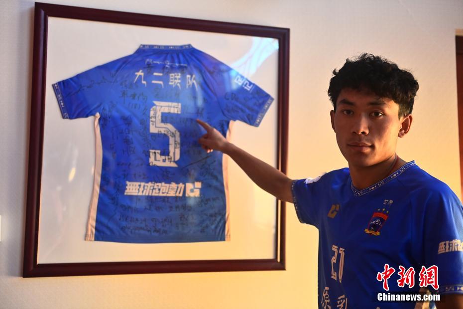 10月14日,在甘肅省甘南藏族自治州合作市甘南九二聯(lián)隊俱樂部榮譽展廳內(nèi),隊員更高才讓介紹該隊5號是中國足球協(xié)會杯第一個進球的藏族球員。