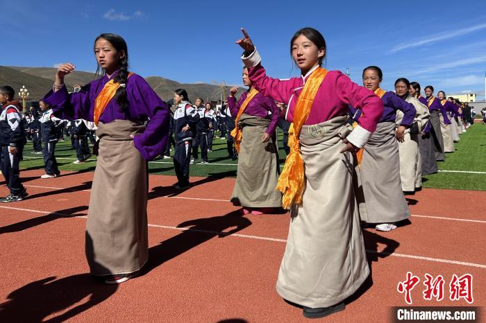 近日,色達縣中學東校區(qū),學生們在跳藏族鍋莊舞。中新社記者 王鵬 攝