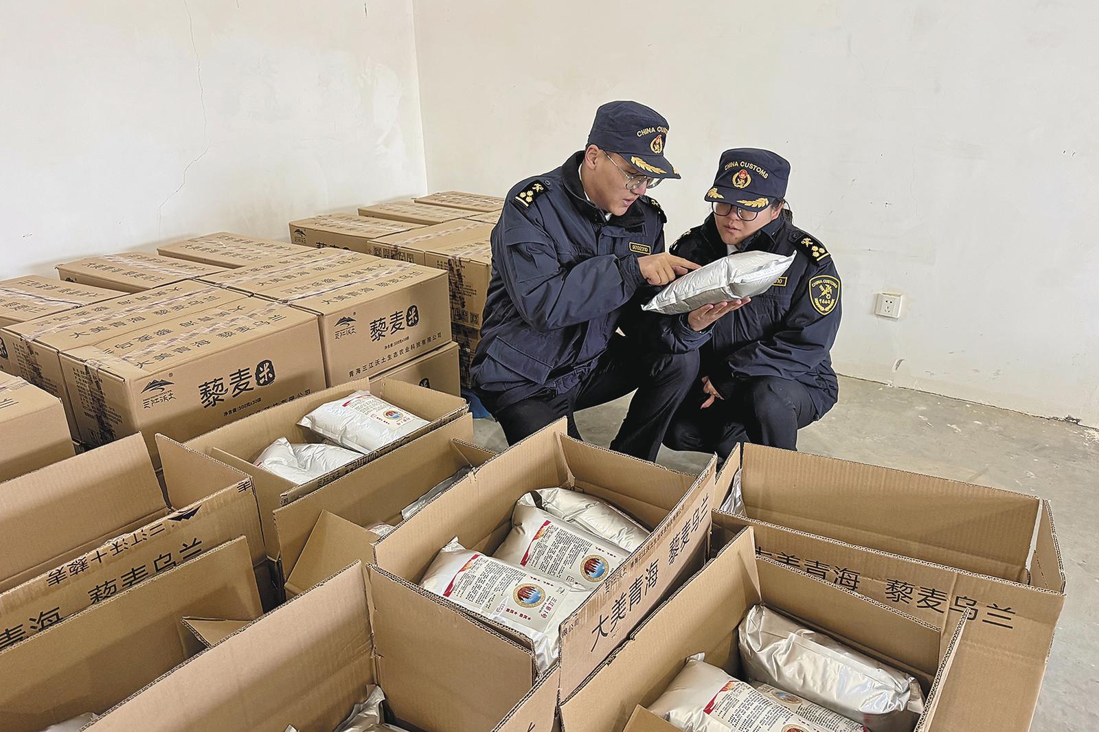 西寧海關(guān)在青海三江沃土生態(tài)農(nóng)業(yè)科技有限公司對(duì)出口藜麥種子開展現(xiàn)場(chǎng)查驗(yàn)。西寧海關(guān)供圖