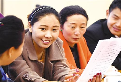 3月7日下午,人大西藏自治區(qū)代表團(tuán)舉行全體會議,審議憲法修正案草案。全國人大代表次仁措旦(左二)與其他代表進(jìn)行交流。 經(jīng)濟(jì)日報記者 李景錄攝