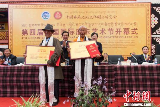 開幕式上西藏文化發(fā)展促進(jìn)會授予國家級非物質(zhì)文化遺產(chǎn)唐卡藝術(shù)代表性傳承人丹巴繞旦、嘎瑪?shù)吕?位唐卡藝術(shù)大師“終身成就獎”。 何蓬磊 攝
