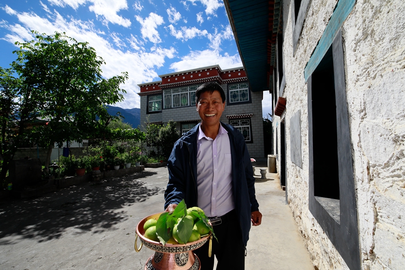 8月24日,熱情的格桑旺久拿出自己家產(chǎn)的水果招待客人。求是網(wǎng)記者 劉玉冰 攝