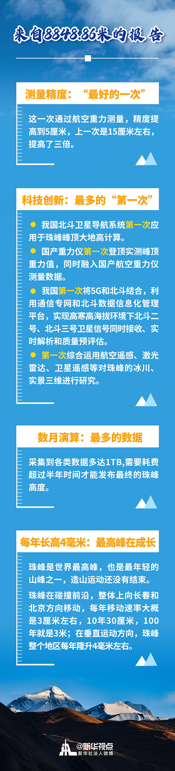 8848.86米:作為世界最高峰的珠穆朗瑪峰最新“身高”8日公布。自然資源部權威人士說,同上一次測量結(jié)果相比,此次測量數(shù)據(jù)的科學性、可靠性、創(chuàng)新性,都達到一個新高度。