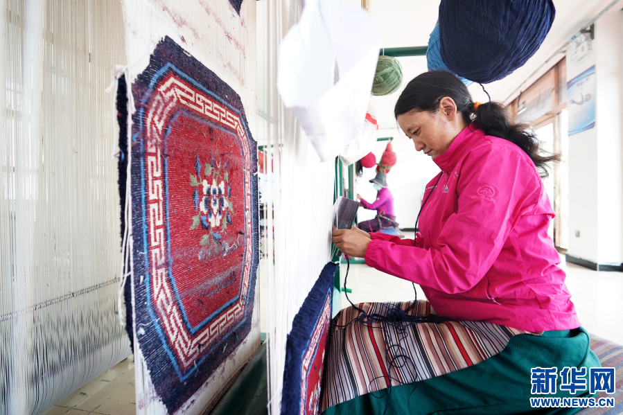 西藏阿里地區(qū)改則縣麻米鄉(xiāng)村民崗增在噶爾縣康樂新居服裝地毯加工廠里工作(7月25日攝)。2017年,崗增和家人搬遷到噶爾縣康樂新居易地扶貧搬遷安置點,住進了125平方米的新居。崗增還就近在安置點的服裝地毯加工廠找到了工作,每個月有3000元左右的收入。新華社記者詹彥 攝