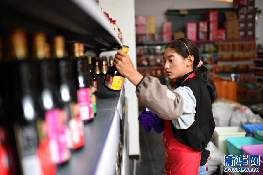 西藏昌都市丁青縣尺牘鎮(zhèn)烏巴村村民斯朗德吉在尺牘鎮(zhèn)的一家超市里打工(9月18日攝)。2018年,斯朗德吉和家人從烏巴村搬遷到尺牘鎮(zhèn)易地扶貧搬遷安置點,住進了寬敞明亮的新房子。斯朗德吉還就近在安置點附近的超市找到了工作,每個月有2000元的收入。新華社記者詹彥 攝