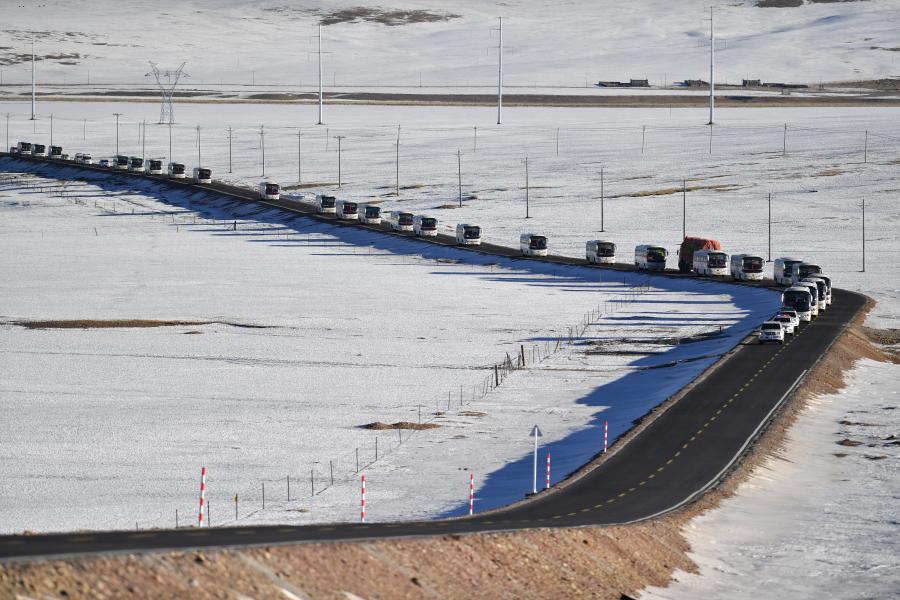 告別平均海拔5000米家鄉(xiāng)的雙湖縣牧民們乘車搬遷至海拔相對(duì)較低的藏南雅魯藏布江南岸的貢嘎縣境內(nèi)(2019年12月23日攝)。新華社記者 覺果 攝