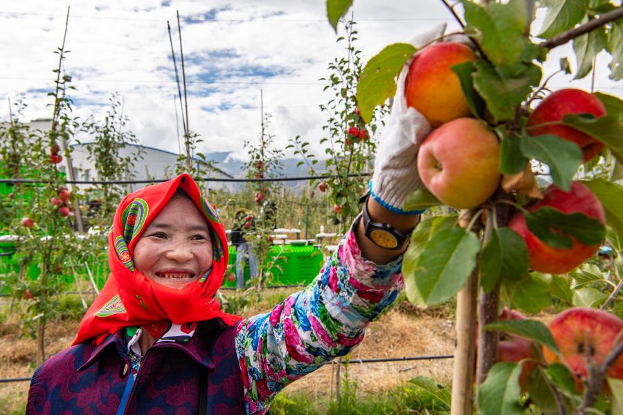 來自雙湖縣措折強(qiáng)瑪鄉(xiāng)才瑪榮村的搬遷群眾嘎瑪在山南市貢嘎縣森布日搬遷安置點(diǎn)的蘋果園內(nèi)采摘蘋果(2020年9月23日攝)。新華社記者 孫非 攝