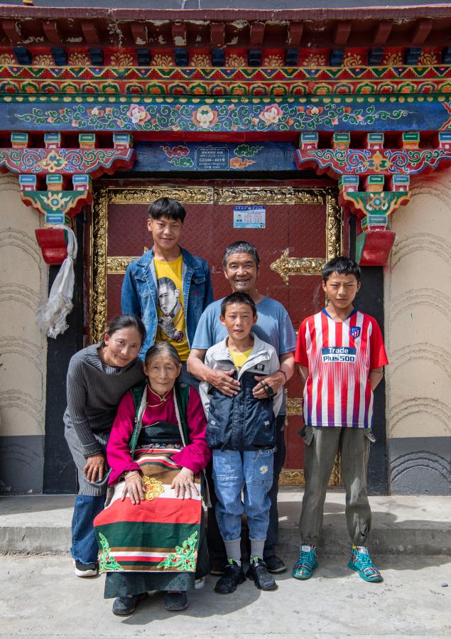 來自雙湖縣措折強(qiáng)瑪鄉(xiāng)71歲的羅達(dá)瓦(后右二)和家人在位于山南市貢嘎縣森布日搬遷安置點(diǎn)的新家門前合影(2020年8月24日攝)。森布日搬遷安置點(diǎn)是西藏極高海拔地區(qū)居民生態(tài)搬遷安置點(diǎn)之一,2019年底,來自那曲市安多縣色務(wù)鄉(xiāng),雙湖縣嘎措鄉(xiāng)、雅曲鄉(xiāng)、措折強(qiáng)瑪鄉(xiāng)的共計(jì)957戶、4058名群眾搬遷至此。新華社記者 孫非 攝