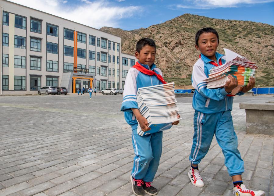 在森布日幸福家園九年一貫制學(xué)校,剛開學(xué)的學(xué)生們在搬新書(2020年8月24日攝)。這個(gè)學(xué)校坐落在山南市貢嘎縣森布日搬遷安置點(diǎn)旁,從高海拔地區(qū)搬遷至此的孩子們可以就近入學(xué)。新華社記者 孫非 攝