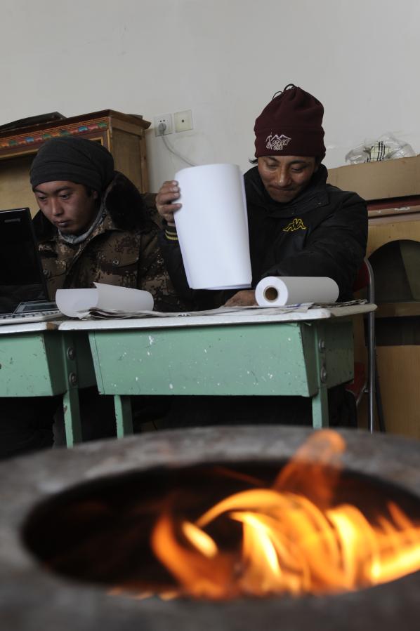 西藏雙湖縣嘎措鄉(xiāng)的干部在開會(huì)時(shí)用牛糞爐子取暖(2013年1月7日攝)。新華社記者 覺果 攝