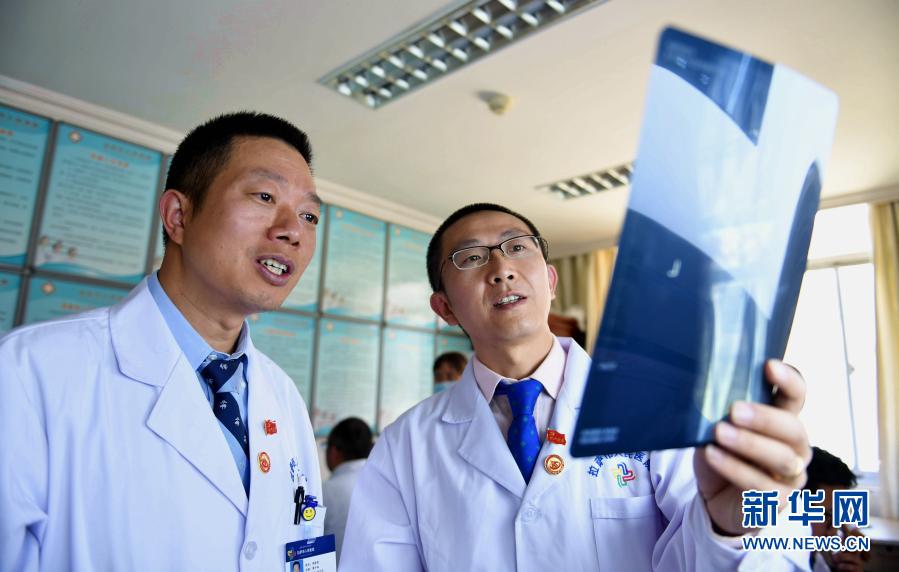 2017年8月3日,在拉薩市人民醫(yī)院骨科病房,北京積水潭醫(yī)院的援藏醫(yī)生龔曉峰(右)和北京天壇醫(yī)院援藏醫(yī)生李家謀查看患者的X光片。新華社記者 晉美多吉 攝