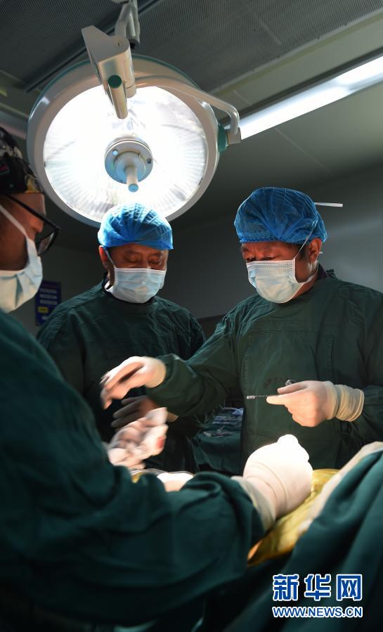 2017年5月26日,援藏醫(yī)生李家謀(右)帶領(lǐng)拉薩市人民醫(yī)院的藏族醫(yī)生進行微創(chuàng)脊柱手術(shù)。新華社記者 覺果 攝
