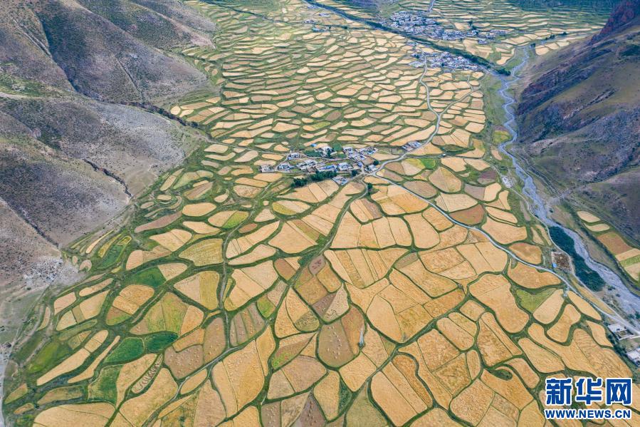 位于拉薩河谷的青稞田(2020年9月9日攝,無人機照片)。新華社記者 普布扎西 攝