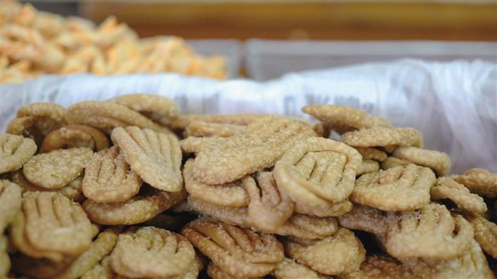 佳節(jié)臨近,拉薩大街小巷一下子“冒”出很多銷售“卡塞”的臨時店鋪和攤檔,有些街道甚至成了“卡塞”一條街??ㄈ怯妹娣郏ㄓ械募尤胨钟停┲谱鞯挠驼ㄊ称?,形狀多樣,作為藏歷新年不可或缺的年貨,卡塞是最受當(dāng)?shù)乩习傩障矏鄣囊环N食品,是款待客人的美味佳肴。
