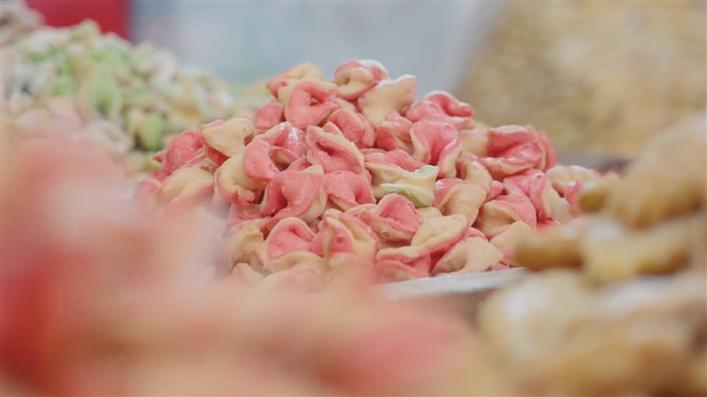 揉面、切割、染色,面片經(jīng)店員們巧手捏成條形、圓形、蝴蝶形等不同樣式,最后放到鍋里炸至金黃;出鍋時,再瀝上油、撒上白糖,香甜可口、樣式精美的卡塞就制作完成了。