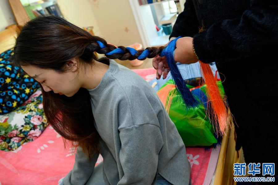 2月12日,在位于西藏自治區(qū)山南市乃東區(qū)的家中,母親幫助格央扎辮子。新華社記者 劉金海 攝