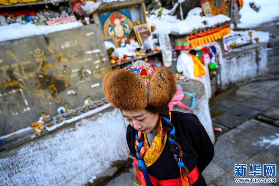 2月12日,在西藏自治區(qū)山南市乃東區(qū)澤當(dāng)鎮(zhèn),格央(左)和家人一起,在藏歷新年第一天轉(zhuǎn)山祈福。新華社記者 劉金海 攝