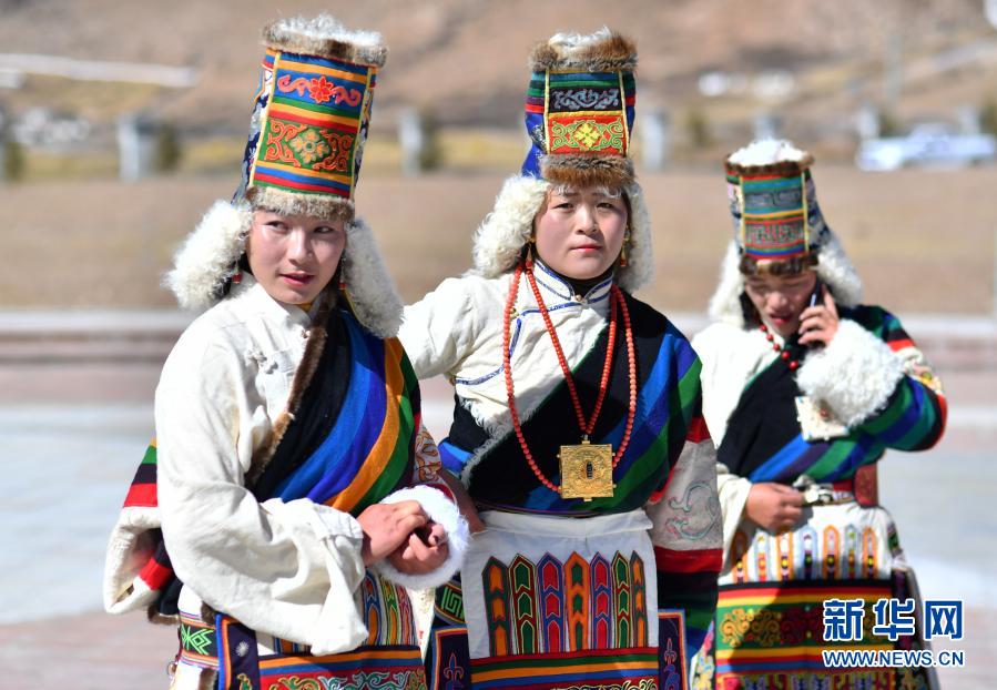 2月12日在藏北當雄縣拍攝的三名盛裝牧女。新華社記者 覺果 攝