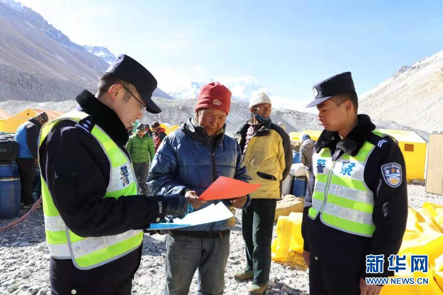 在珠峰大本營(yíng)執(zhí)勤點(diǎn),民警開展普法宣傳(2月攝)。新華社發(fā)(鄭勁松 攝)