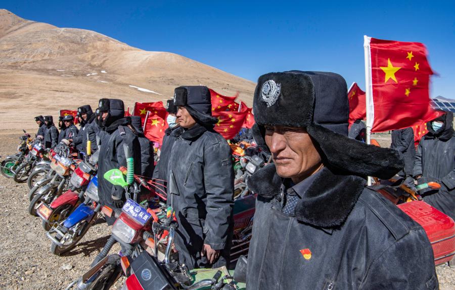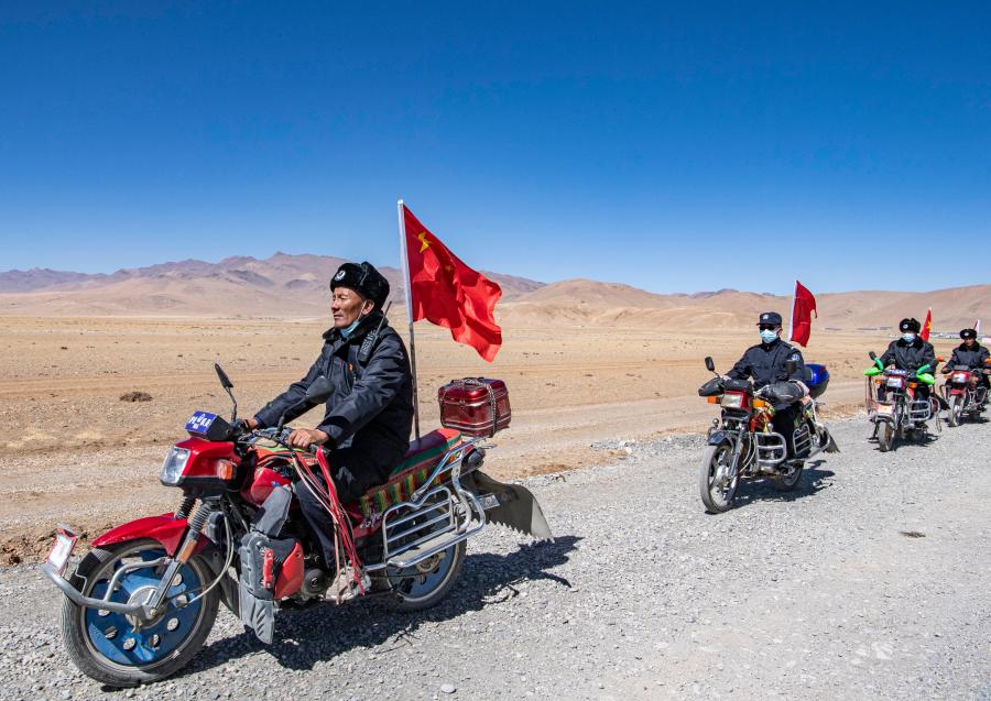 西藏日喀則市薩嘎縣昌果鄉(xiāng)的一處村莊里,48歲的藏族漢子石覺(jué)塔布在風(fēng)中跨上一輛摩托車(chē),向平坦無(wú)垠的高原邊緣騎去。他的車(chē)尾插著一面五星紅旗,被風(fēng)吹得獵獵作響,即便駛出很遠(yuǎn),那抹紅色在車(chē)輪卷起的煙塵中也依然醒目。