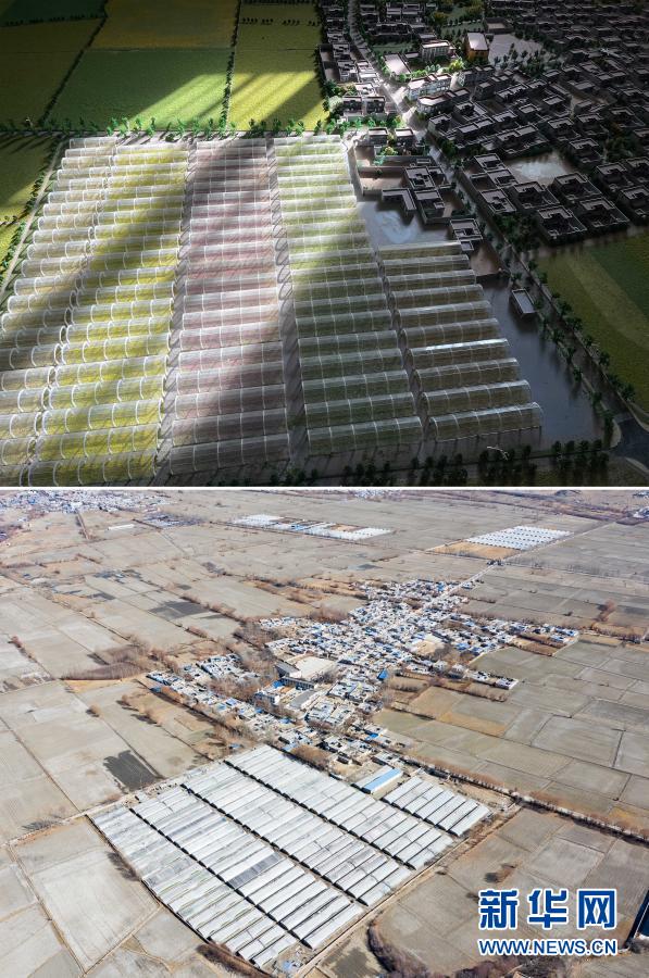 拼版照片的上圖是西藏山南市乃東區(qū)克松社區(qū)農(nóng)業(yè)產(chǎn)業(yè)生產(chǎn)基地規(guī)劃沙盤(2月9日攝);下圖是克松社區(qū)農(nóng)業(yè)產(chǎn)業(yè)生產(chǎn)基地(2月9日攝,無人機(jī)照片)。新華社記者 普布扎西 攝