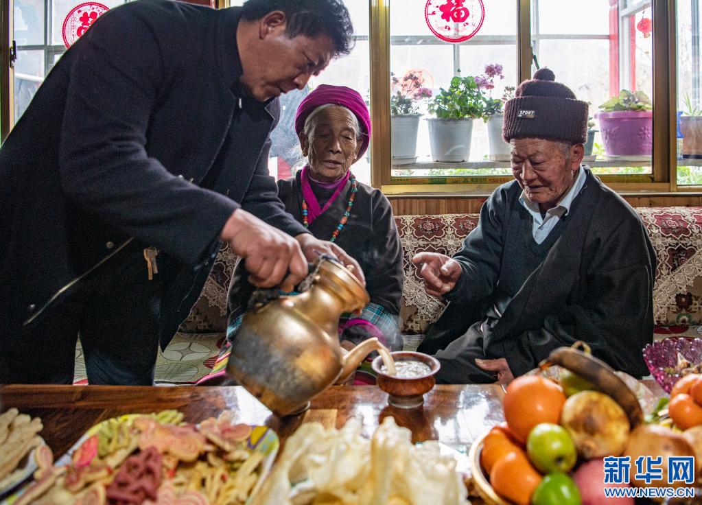 家人為昂旺尼瑪(右一)倒甜茶(2月18日攝)。新華社記者 孫非 攝