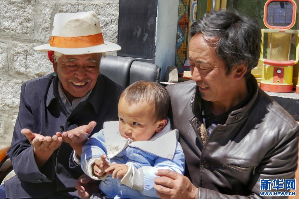 頓珠旺杰(左)和重孫玩耍(4月5日攝)。新華社記者 孫陽 攝