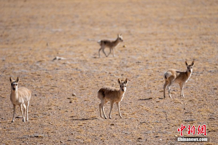 “五一”小長假,中新網(wǎng)記者沿省干線公路自駕西藏自治區(qū)那曲羌塘草原腹地雙湖縣、申扎縣及班戈縣等地,看到當(dāng)?shù)夭亓缪?、藏野驢、藏原羚等成群覓食。羌塘草原平均海拔4500多米,對人類而言氣候條件惡劣,但動物們卻將此作為“天堂”。圖為5月3日,西藏班戈縣草原上的4只藏原羚,當(dāng)?shù)啬撩穹Q為黃羊。江飛波 攝