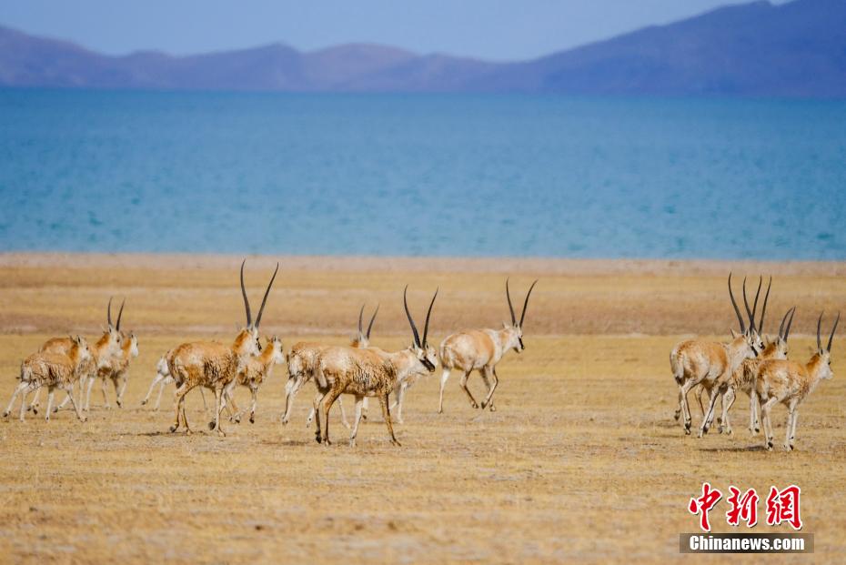 圖為5月2日,西藏那曲色林錯湖邊的藏羚羊群。江飛波 攝