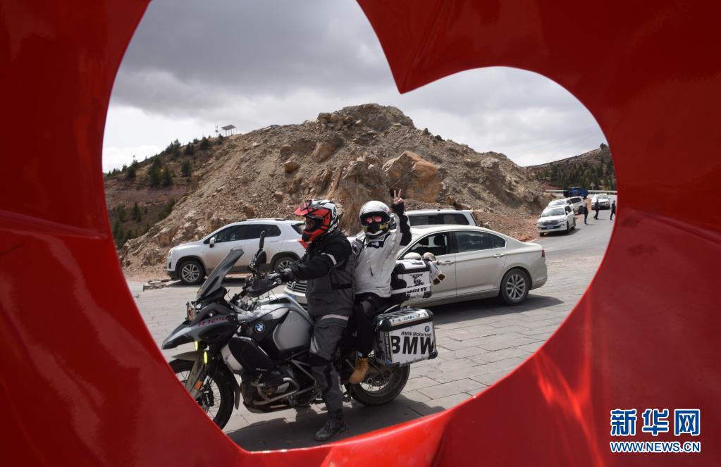 在西藏芒康縣拉烏山,一對(duì)騎行摩托的年輕人準(zhǔn)備出發(fā)(5月2日攝)。新華社記者 陳燮 攝