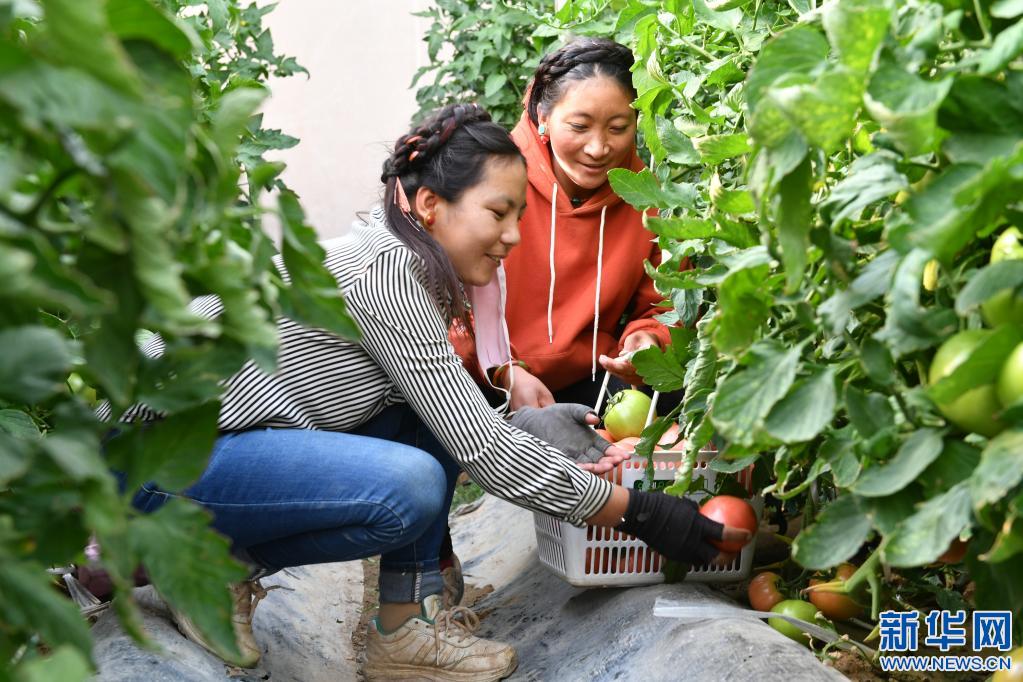 工作人員在西藏阿里噶爾縣生態(tài)農(nóng)業(yè)產(chǎn)業(yè)園采摘西紅柿(2018年8月1日攝)。新華社記者張汝鋒 攝