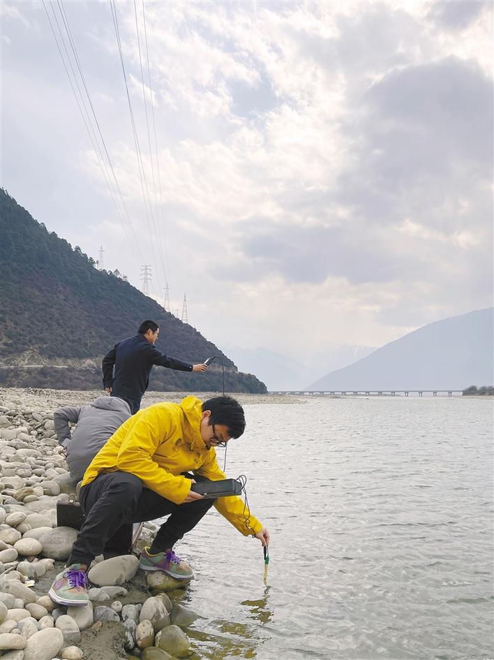 監(jiān)測(cè)組人員在川藏鐵路附近重要水體開展現(xiàn)場(chǎng)監(jiān)測(cè)。