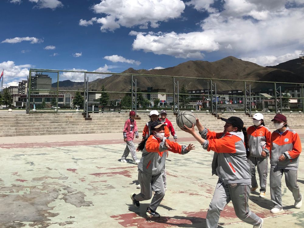 6月1日,西藏自治區(qū)拉薩市,拉薩那曲第二高級中學女學生們在操場打籃球。新華社記者齊菲攝