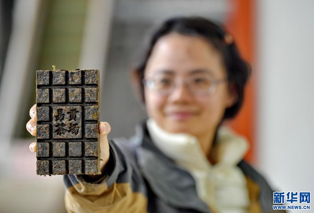 西藏易貢茶場的一名工作人員展示生產(chǎn)的特色茶磚(5月22日攝)。新華社記者 張汝鋒 攝