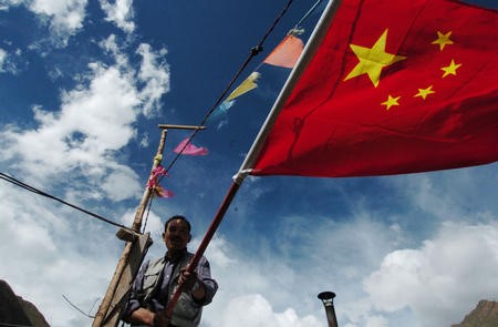 青藏鐵路沿線的藏族群眾紛紛掛起國(guó)旗,喜迎青藏鐵路全線通車。
