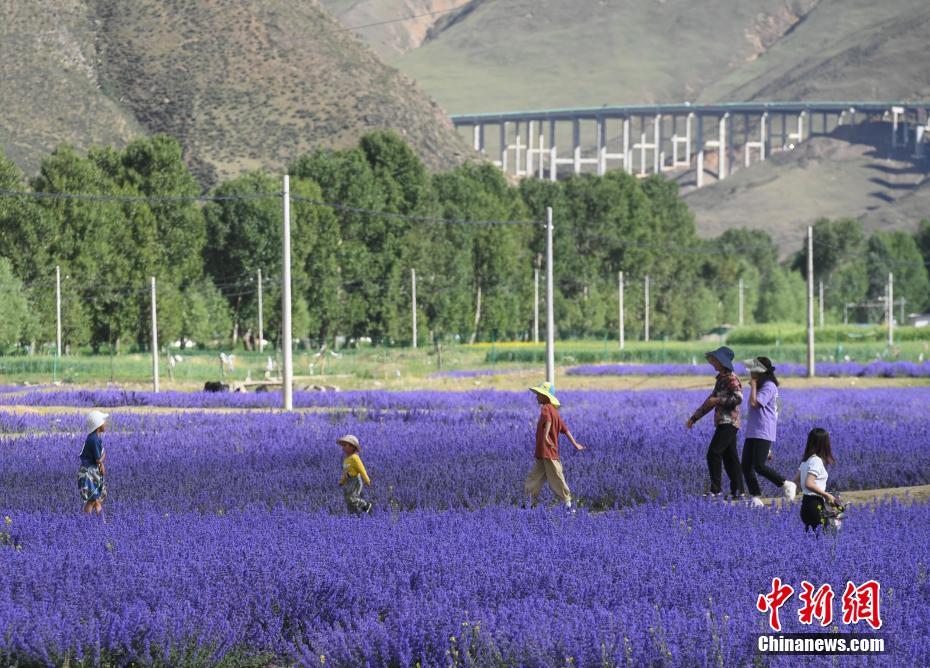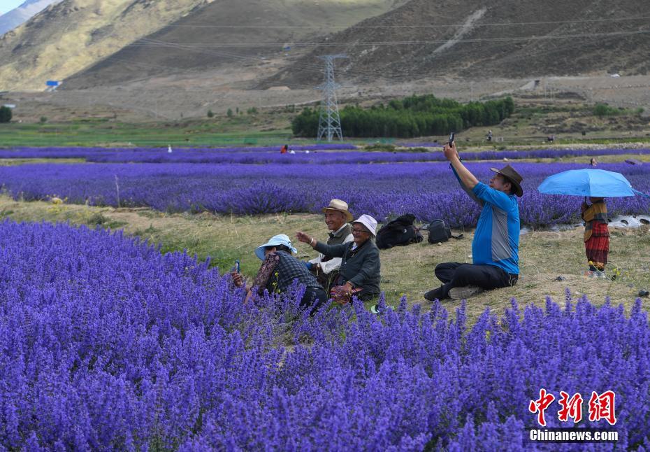 6月25日,位于西藏自治區(qū)拉薩市達(dá)孜區(qū)新倉村貝拉莊園的100畝薰衣草花海競相綻放,吸引不少游客和當(dāng)?shù)厥忻袂皝碛瓮妗⑴恼?。中新社記?貢嘎來松 攝