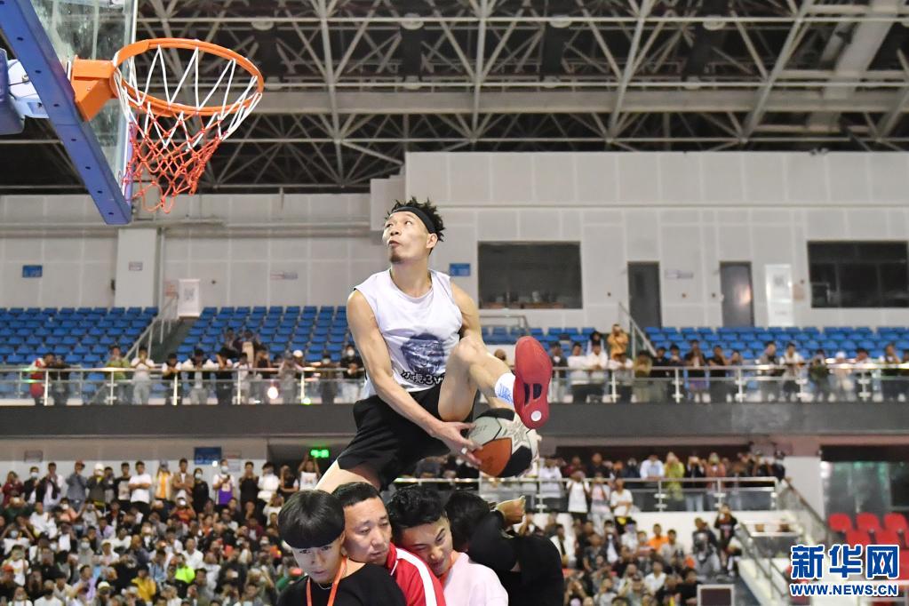 7月3日,陳登星(上)表演扣籃。新華社記者 孫瑞博 攝