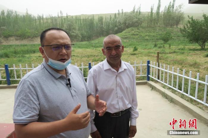 圖右為新疆維吾爾自治區(qū)和田地區(qū)于田縣普魯村村民西日普·依布地,他也是當(dāng)年先遣連見證者的后代。 中新社記者 楊程晨 攝