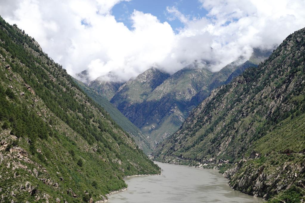 盛夏時節(jié),走近雅魯藏布江中游的藏木水電站,這里水量豐沛,藍天白云、漫山青松倒映在碧綠的江水中。