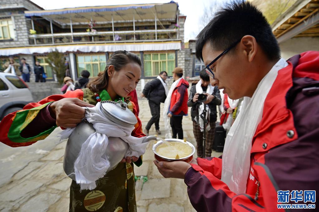 2016年11月15日,在拉薩市奪底鄉(xiāng)維巴村,一名民宿負(fù)責(zé)人為剛抵達(dá)的游客斟滿(mǎn)青稞酒。 劉東君 攝
