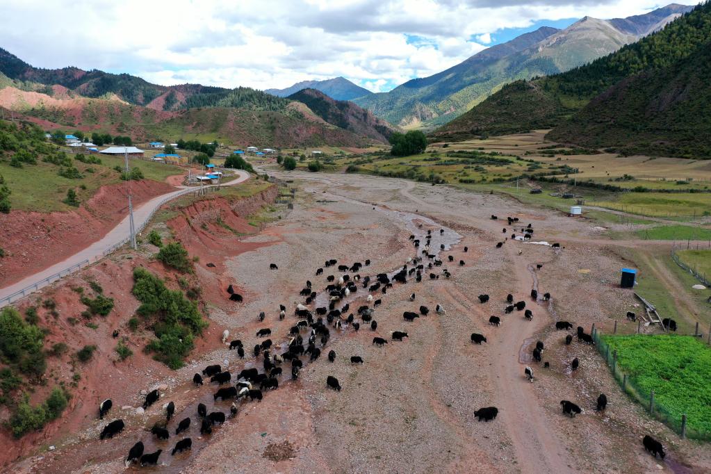 昌都市類烏齊縣賓達(dá)鄉(xiāng)央宗村央宗牦牛育肥基地的牦牛(2020年9月21日攝,無(wú)人機(jī)照片)。新華社記者 詹彥 攝
