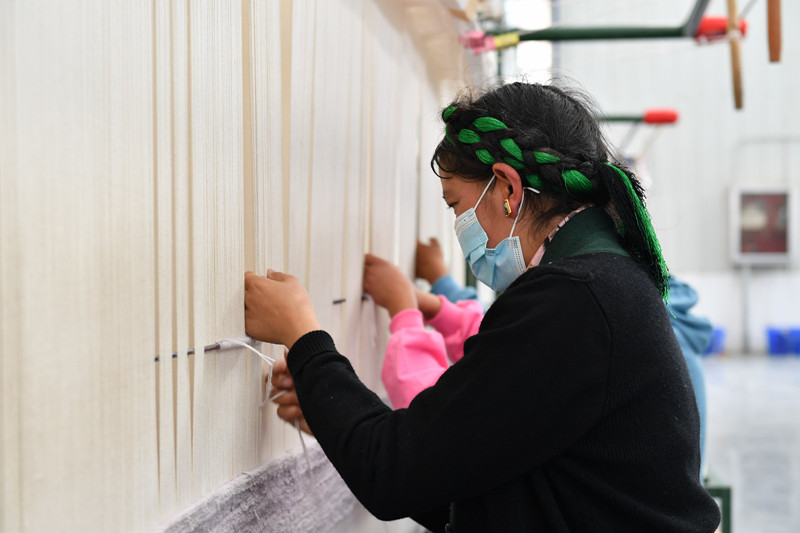 圖為西藏自治區(qū)日喀則市年呢?zé)槻靥杭庸I(yè)合作社的技師在編制藏毯。唐斌 丹增群培 攝